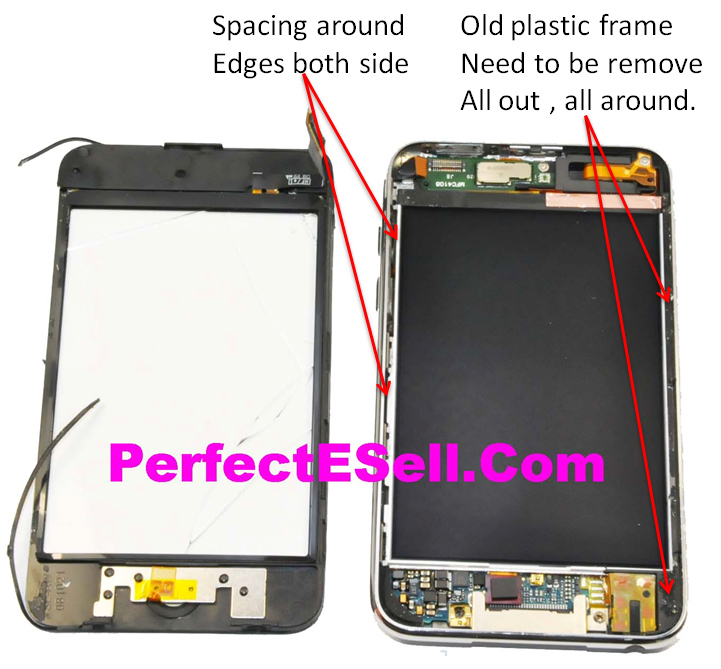 - When install, please do not use force but please plug test first, before fully install / close down the frame, please make sure you remove all the left old plastic frame all around and you must align the inside LCD to give the space around the edge enough to close the digitizer frame to get it fit perfectly.